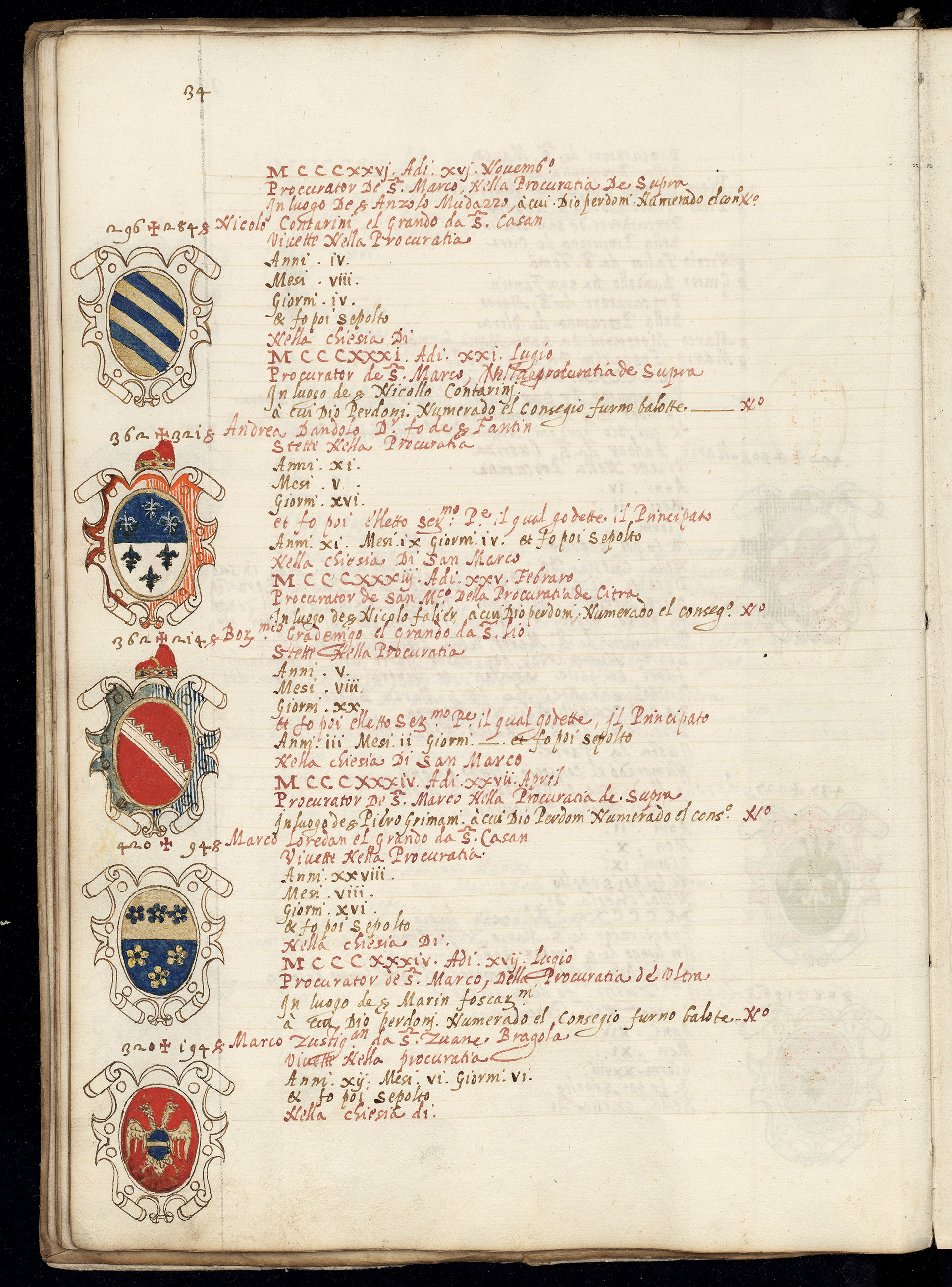 Unica carica a vita prevista nell’ordinamento pubblico veneziano, oltre alla dogale e a quella del cancellier grando (che però non era patrizio), era quella di procuratore di San Marco. La figura dei procuratori era di antichissima nascita, risalendo infatti forse addirittura al IX secolo; il loro numero, come le attribuzioni, variò nel tempo. Essi si suddividevano tra procuratori de supra, de citra e de ultra, intendendo con la denominazione determinare le competenze rispettivamente sull’area marciana e sui due lati del Canal Grande. Prendendo residenza nelle Procuratie, essi si occupavano della sovrintendenza sulla manutenzione della Piazza e specialmente su quanto atteneva alla gestione della chiesa di San Marco – fino ai primi anni del XIX secolo cappella ducale, retta per lo spirituale da un primicerio e non sottoposta all’ordinario diocesano – in ordine al tesoro, alla cura dell'immobile e a quanti vi prestavano servizio, compresi i componenti della famosa cappella musicale, sempre diretta da insigni maestri, che accompagnava le liturgie. Fondamentali le mansioni dei Procuratori relative alla tutela delle vedove e degli orfani, nonché alla gestione degli ingenti patrimoni che molti testatori affidavano loro, confidando nella sicurezza garantita dallo Stato. Si occupavano anche degli ospedali e dei luoghi sacri di giurisdizione dogale. La dignità che la carica di procuratore comportava per chi la rivestiva e per la casata di appartenenza fece sì che essa fosse sempre molto ambita, tanto che dal XVI secolo, per fare fronte alle esigenze finanziarie poste dai ripetuti conflitti, vennero creati dei procuratori in sovrannumero, «fatti per soldo». Testimonianza del rilievo sempre attribuito alla dignità procuratoria sono le molte compilazioni, anche private, che ne contengono l’elenco, con indicazione del cursus honorum dei diversi titolari e altri riferimenti. Ne è un esempio il ricco registro intitolato Cronaca dei Procuratori di San Marco con stemmi, che riporta una cronaca delle elezioni a procuratore dall’anno 812 al 1627.