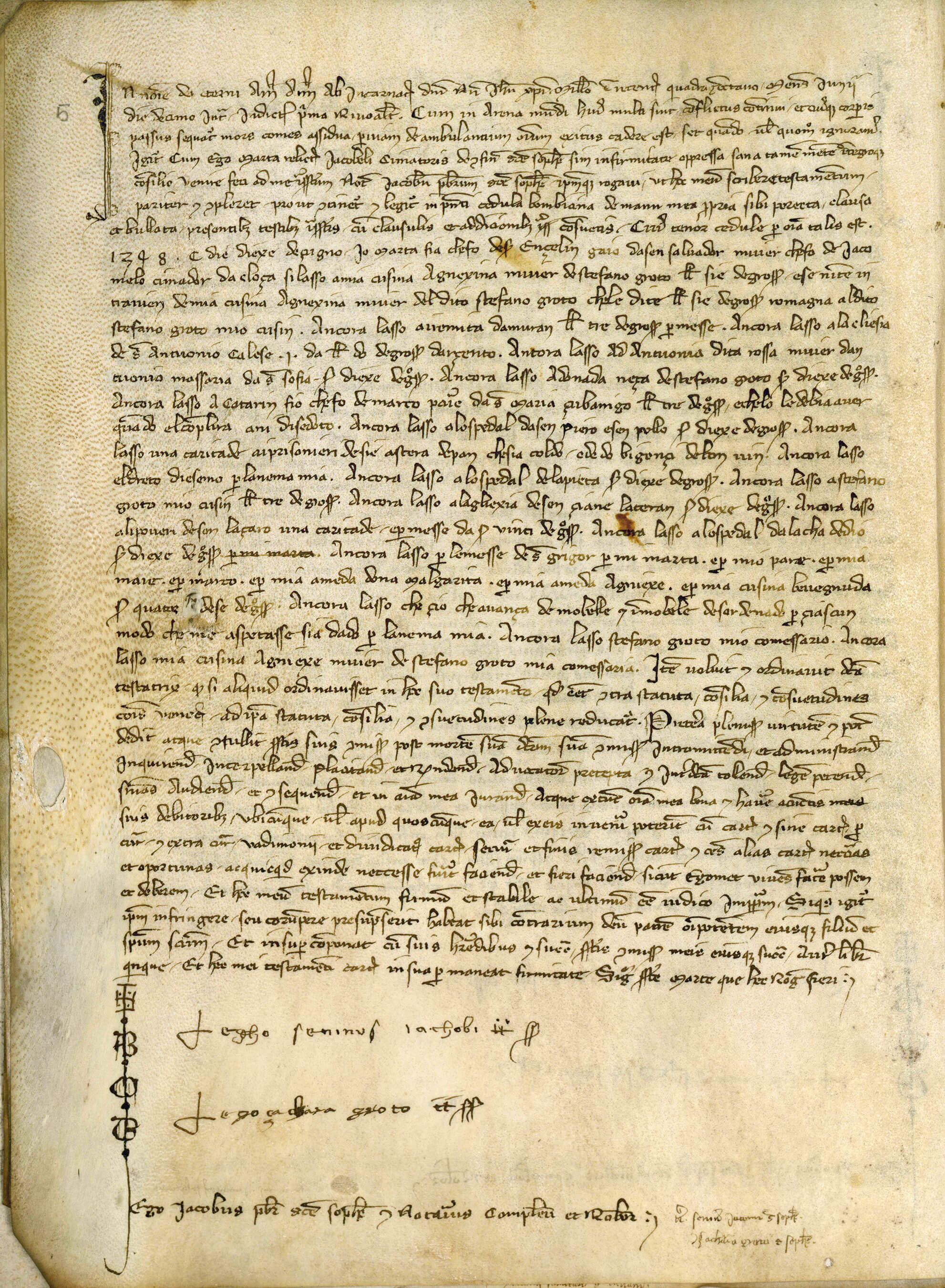 Non sappiamo a quanto potesse ammontare complessivamente tra beni mobili e immobili la sostanza di cui disponeva con il suo testamento autografo il 10 giugno del 1348 «Marta che fo de ser Ençelin Gaio da Sen Salvador, muier che fo de Iacomelo cimador da Cloça»; non sappiamo neppure se Marta possa essere considerata una delle tante vittime della peste nera che in quel volger d’anni imperversava a Venezia come del resto in tutta Europa, atteso che la formula notarile «infirmitate oppressa, sana tamen mente integroque consilio» altro non era che una costante, sostanzialmente identica a se stessa e ricorrente nella maggior parte delle manifestazioni di ultima volontà rogate dal notaio. Quel che è certo è che Marta lascia una somma più che discreta in denaro sonante destinata più o meno equamente a parenti vari, ordini religiosi («ai Remita da Muran lire tre de grossi per messe»), chiese («Sen Antuonio, Sen Çiane Lateran»), ospedali («Sen Piero e Sen Pollo, Pietà, Cha de Dio»), oltre a «una caritade ai prisonieri de sie astera de pan che sia coldo [sic!] e de do bigonçi de bon vin», e un’altra «caritade da soldi vinti de grossi ali poveri de Sen Laçaro e per messe [da celebrarsi]». Tra i beneficiari delle messe votive «de sen Grigor», per le quali dispone la somma di ben 14 soldi di grossi, la testatrice menziona espressamente il padre e la madre, un non meglio precisato Marco, due zie e una cugina («per mia ameda dona Malgarita e per mia ameda Agniexe, e per mia cusina Benvegnuda») oltre naturalmente a se stessa. In tutto lascia 21 lire e 14 soldi di grossi, somma cui bisognerà aggiungere il residuo di tutti i suoi beni, mobili e immobili, destinato immancabilmente a legati pro anima: «ancora lasso che çiò che avança de mobelle et immobele desordenado, per çiascun modo che me aspetasse, sia dado per l’anema mia». Più che evidente, allora, la preoccupazione di Marta, del resto comune a quella di ogni altro testatore di quei secoli, per il proprio destino post mortem, da preordinare in qualche modo con messe votive e disposizioni benefiche pro anima.