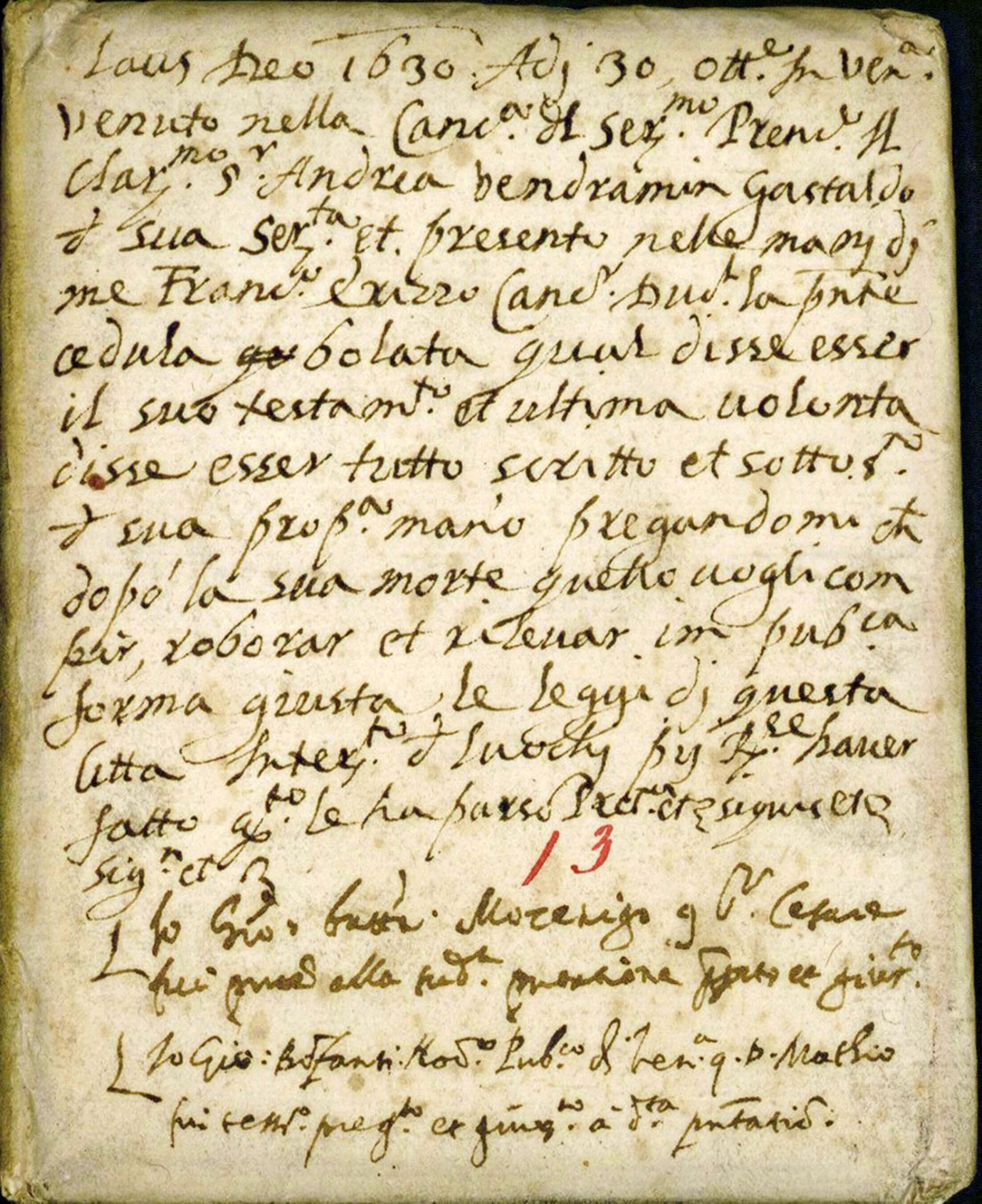Rogito del testamento autografo di Andrea Vendramin, gastaldo ducale, redatto in terza persona dal notaio e cancelliere ducale Francesco Erizzo il 30 ottobre 1630; anche in questo caso mentre infuria l’ennesima epidemia di peste: