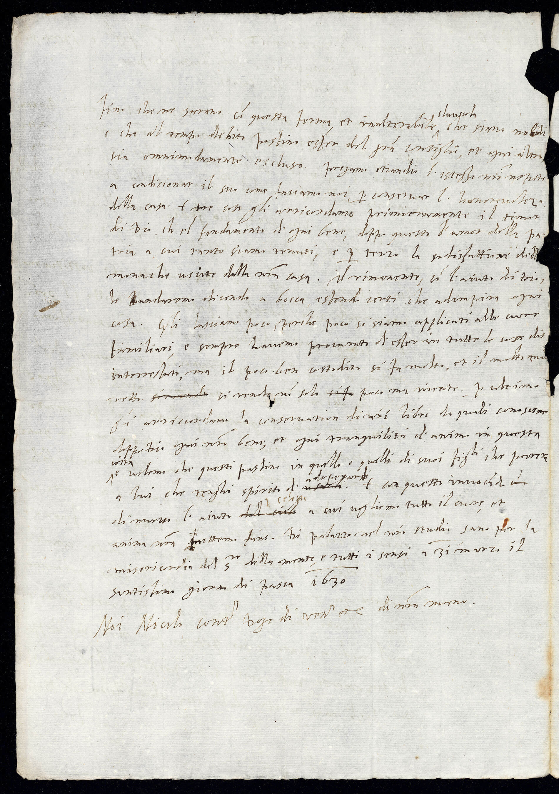 Al culmine di una carriera che lo aveva visto insediato nelle massime cariche della Repubblica, e comunque protagonista indiscusso della vita politica e culturale veneziana a partire dagli ultimi due decenni del Cinquecento, uomo di profondo sentire spirituale e di alti sentimenti religiosi, ma ferocemente antipapalino, Nicolò Contarini divenne doge in età avanzata e poté sostenere il dogado per soli quindici mesi. «Dogado breve, dogado tragico, quello del Contarini», del quale «la peste [...] costituirà lo sfondo più tremendo». Dogado del quale «rimarrà, a ricordo […] la chiesa della Salute […]. Sembrava un'ironia della sorte che la memoria del doge antipapalino, del “Contarinetto gran di pevere”, come l'avevan soprannominato i suoi avversari ecclesiastici, fosse affidata a un'opera di pietà», com'ebbe a scrivere Gaetano Cozzi. Nel testamento autografo, scritto con mano ormai tremula «il santissimo giorno di Pasca» del 1630, e consegnato nove giorni più tardi al cancelliere inferiore Francesco Erizzo, presenti come testi due segretari ducali, Contarini, scapolo e senza figli, istituisce erede universale il nipote Francesco, con la condizione che i beni stabili rimanessero sempre ai discendenti maschi della famiglia. Rammenta anche «il timor di Dio, ch'è 'l fondamento di ogni bene», e «l'amor della Patria, a cui tanto siamo tenuti». E così pure l'amore per i libri, «da’ quali conoscemo doppo Dio ogni nostro bene et ogni tranquillità d'animo in questa vita».
