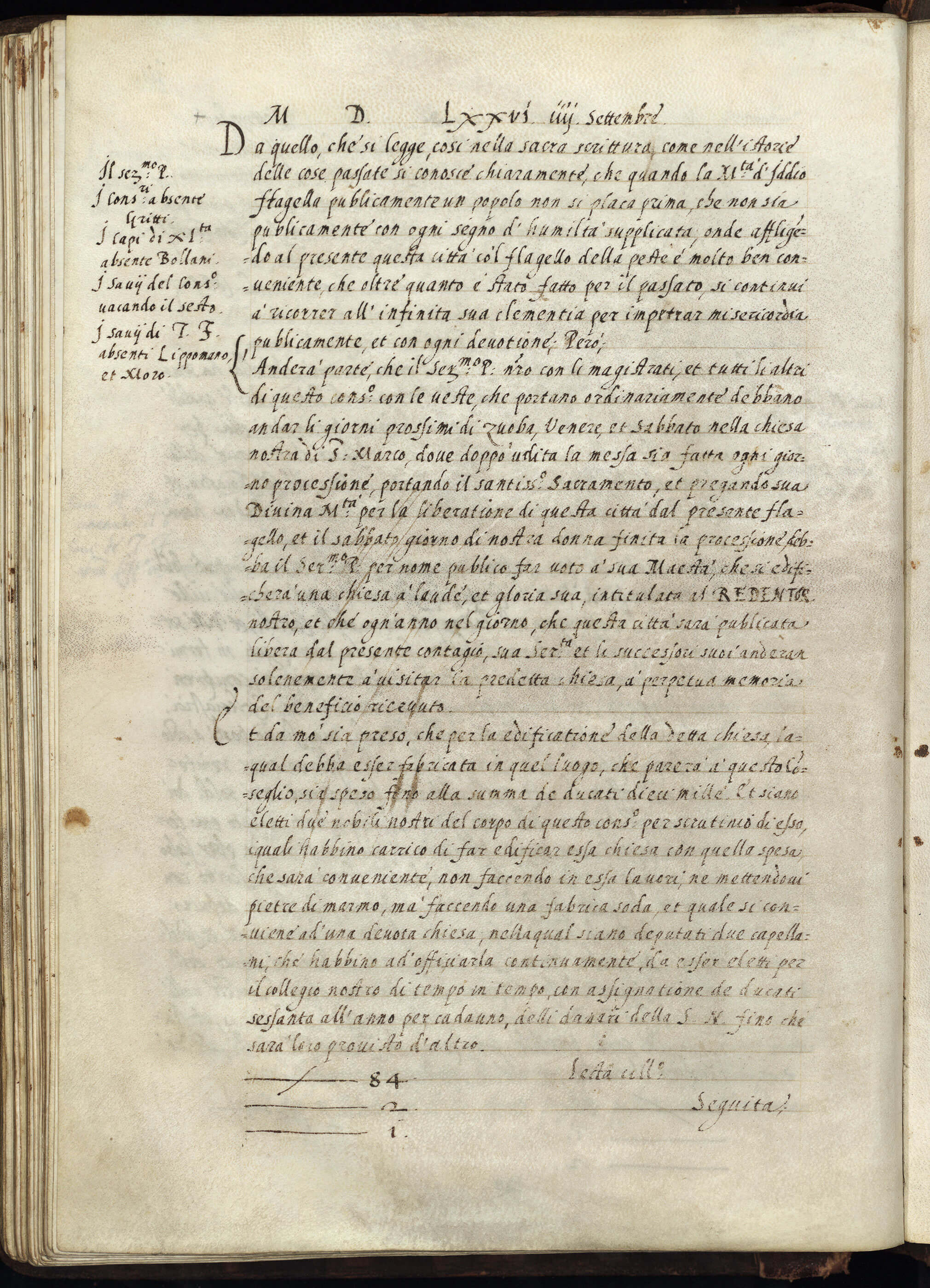 Da quello che si legge così nella sacra scrittura come nell’istorie delle cose passate si conosce chiaramente che quando la maestà d’Iddio flagella publicamente un popolo non si placa prima che non sia publicamente con ogni segno d’humiltà supplicata. Onde, affliggendo al presente questa città col flagello della peste, è molto ben conveniente che oltre quanto è stato fatto per il passato si continui a ricorrer all’infinita sua clementia per impetrar misericordia publicamente et con ogni devotione: però l’anderà parte che il serenissimo prencipe nostro con li magistrati et tutti li altri di questo consiglio, con le veste che portano ordinariamente, debbano andar li giorni prossimi di zuoba, venere et sabbato nella chiesa nostra di San Marco, dove doppo udita la messa sia fatta ogni giorno processione portando il Santissimo Sacramento et pregando sua divina maestà per la liberatione di questa città dal presente flagello; et il sabbato, giorno di Nostra Donna, finita la processione debba il serenissimo prencipe per nome publico far voto a sua maestà che si edificherà una chiesa a laude et gloria sua, intitulata al REDENTOR nostro, et che ogn’anno, nel giorno che questa città sarà publicata libera dal presente contagio, sua serenità et li successori suoi anderà solenemente a visitar la predetta chiesa, a perpetua memoria del beneficio ricevuto.
