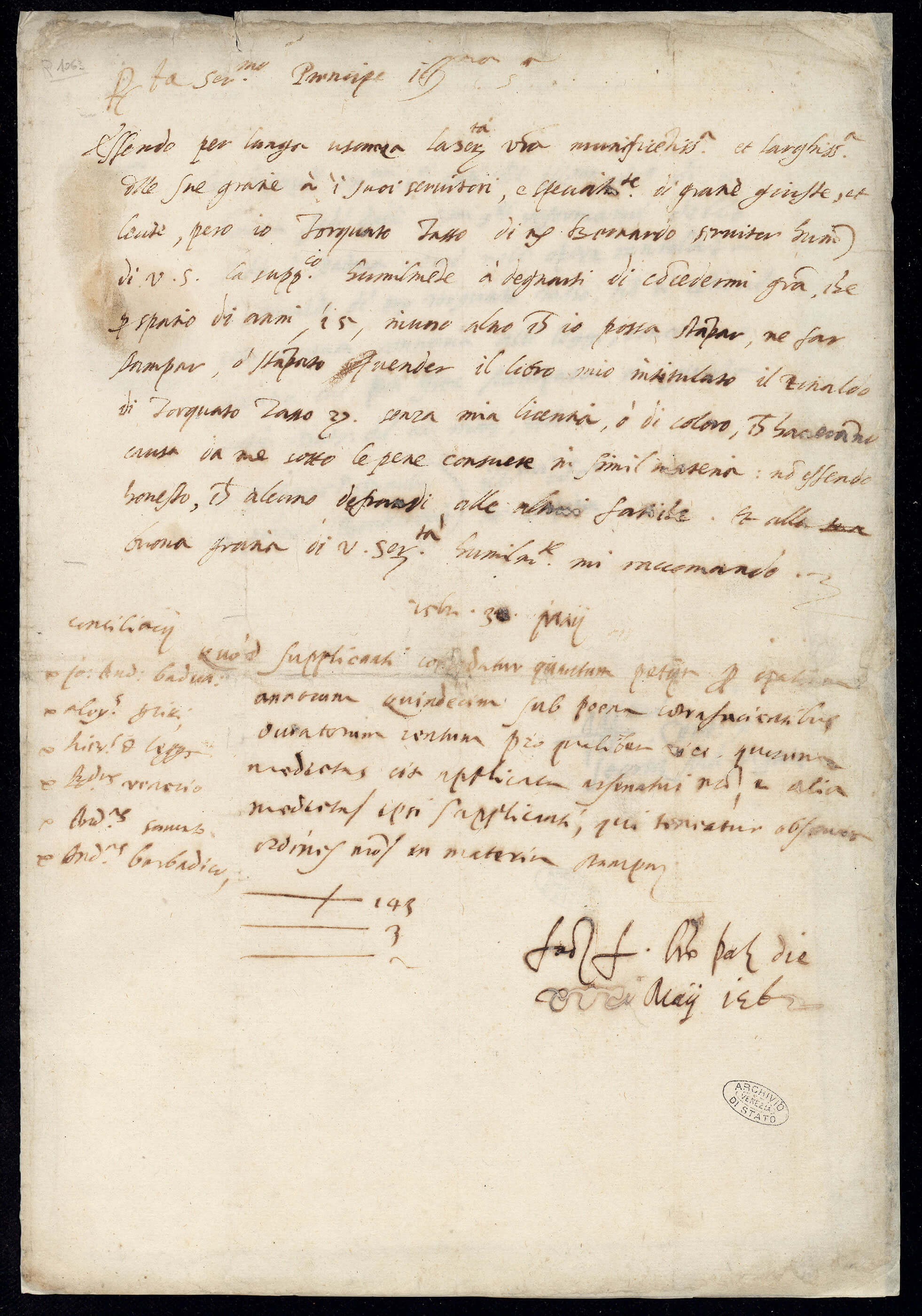 Il 30 maggio 1562, accingendosi alla pubblicazione dell’opera, il giovane Torquato si era indirizzato al Doge perché gli concedesse l’esclusiva sulla stampa, in modo che per un certo arco di tempo egli potesse essere il solo a trarne un utile (la Repubblica, com’è noto, era stata la prima a concedere un privilegio di stampa, a Giovanni da Spira, nel 1469): «Essendo per lunga usanza la serenità vostra munificentissima et larghissima delle sue gratie a i suoi servitori, e specialmente di gratie giuste et lecite, però io Torquato Tasso di messer Bernardo, servitor humilissimo di vostra serenità, la supplico humilmente a degnarsi di concedermi gratia, che per spatio di anni 15 niuno altro che io possa stampar, né far stampar o stampato vender il libro mio intitulato Il Rinaldo di Torquato Tasso et cetera senza mia licenza o di coloro che haveranno causa da me, sotto le pene consuete in simil materia, non essendo honesto che alcuno defraudi alle altrui fatiche. Et alla buona gratia di vostra serenità humilmente mi raccomando».