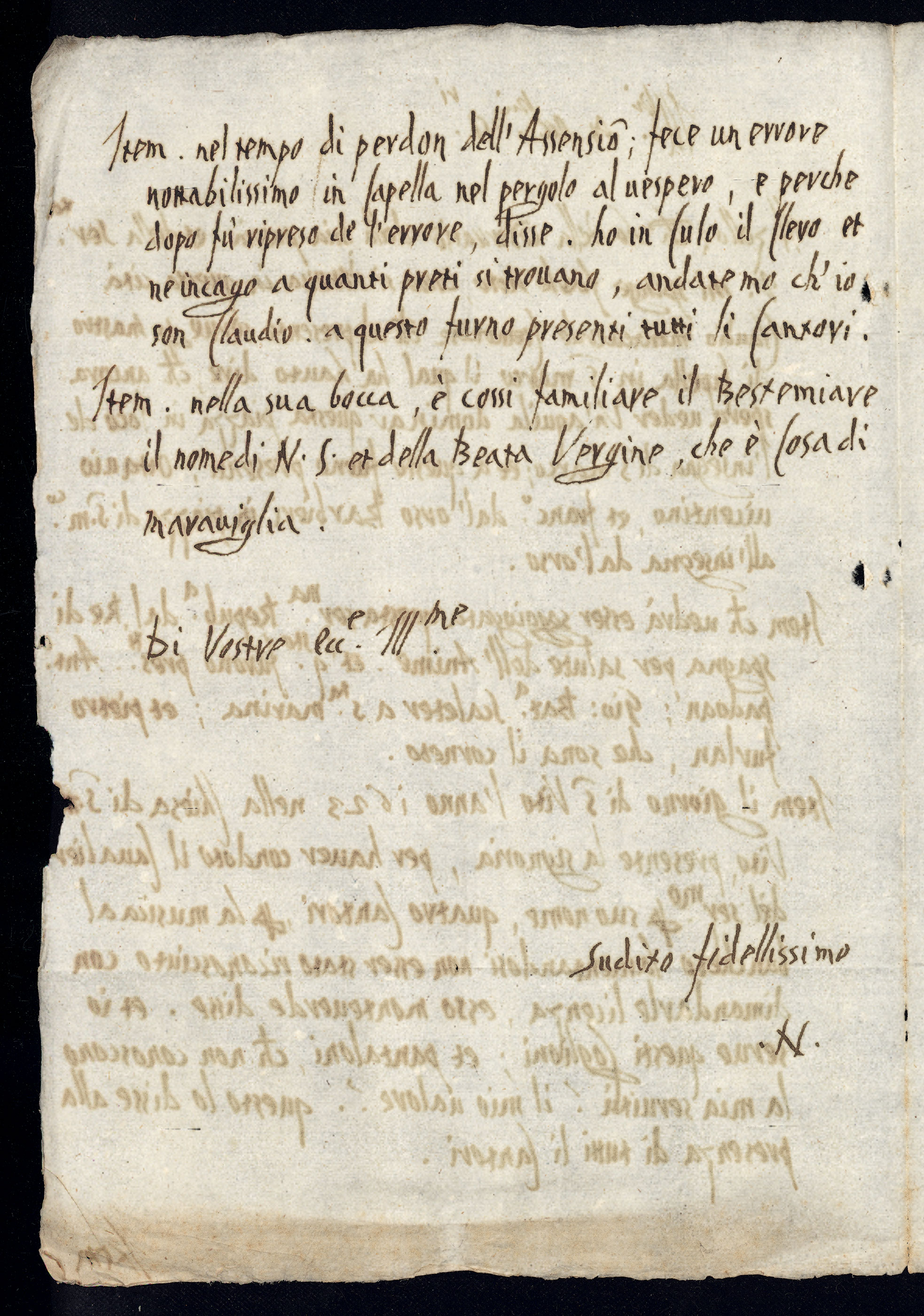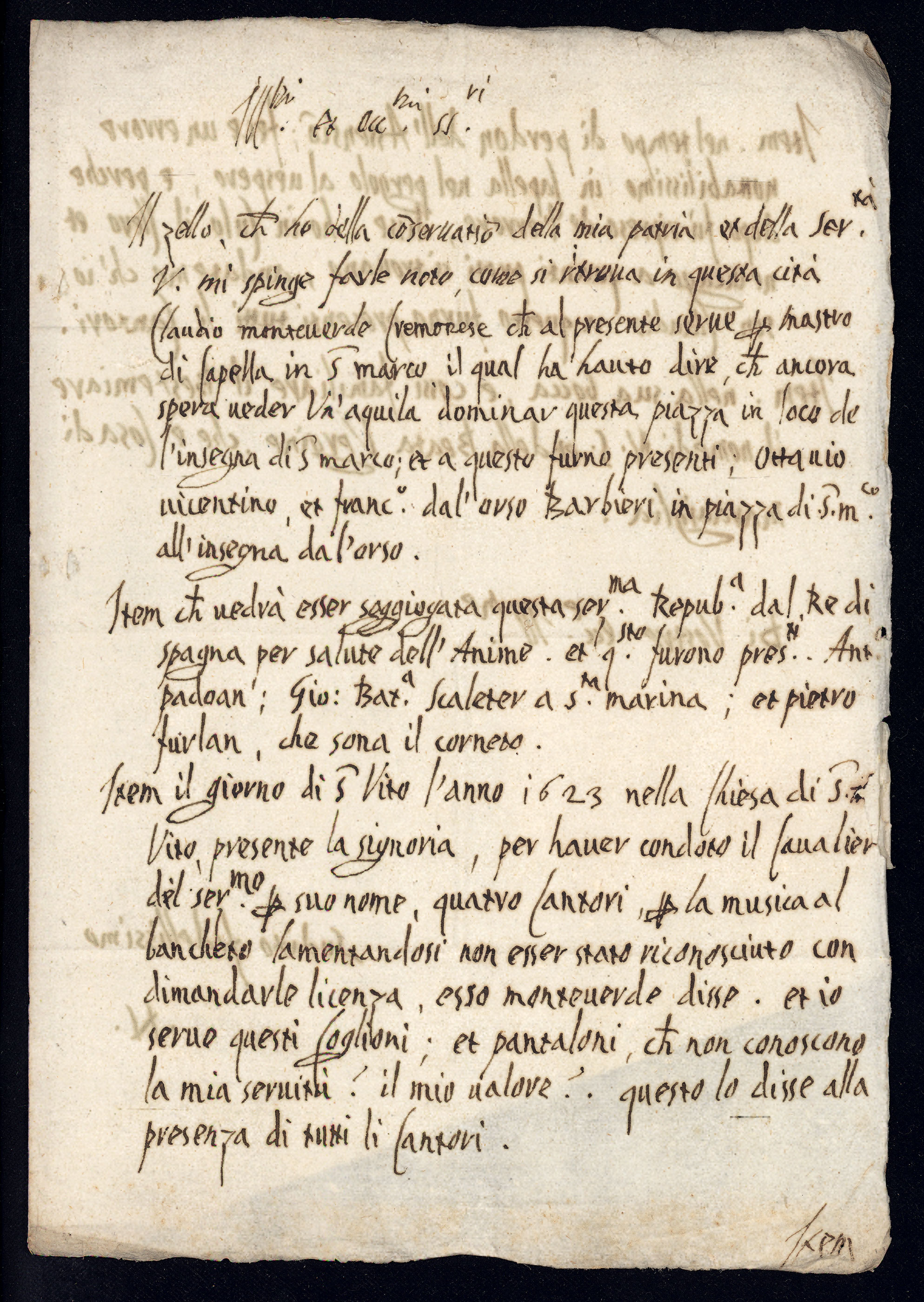 Poco dopo il 1623, dunque, una mano sconosciuta fece pervenire agli Inquisitori una denuncia contro il maestro di cappella. Molte e gravi le accuse, la principale delle quali consisteva nell’attribuirgli – con suffragio di testimoni – di avere pubblicamente esternato un ardente desiderio che anche a Venezia venisse instaurato il dominio imperiale o spagnolo: «Ancora spera veder un’aquila dominar questa Piazza in loco de l’insegna di San Marco»; «Vedrà esser soggiogata questa serenissima Republica dal re di Spagna per salute dell’anime». Negli anni torbidi che seguivano la “congiura di Bedmar”, in un clima accesamente anti-asburgico, una simile imputazione poteva costare la vita. A fronte di ciò, l’espresso dileggio del patriziato veneziano – che l’anonimo metteva pure in bocca a Claudio: «Et io servo questi coglioni et pantaloni, che non conoscono la mia servitù, il mio valore» – passava quasi in secondo piano.