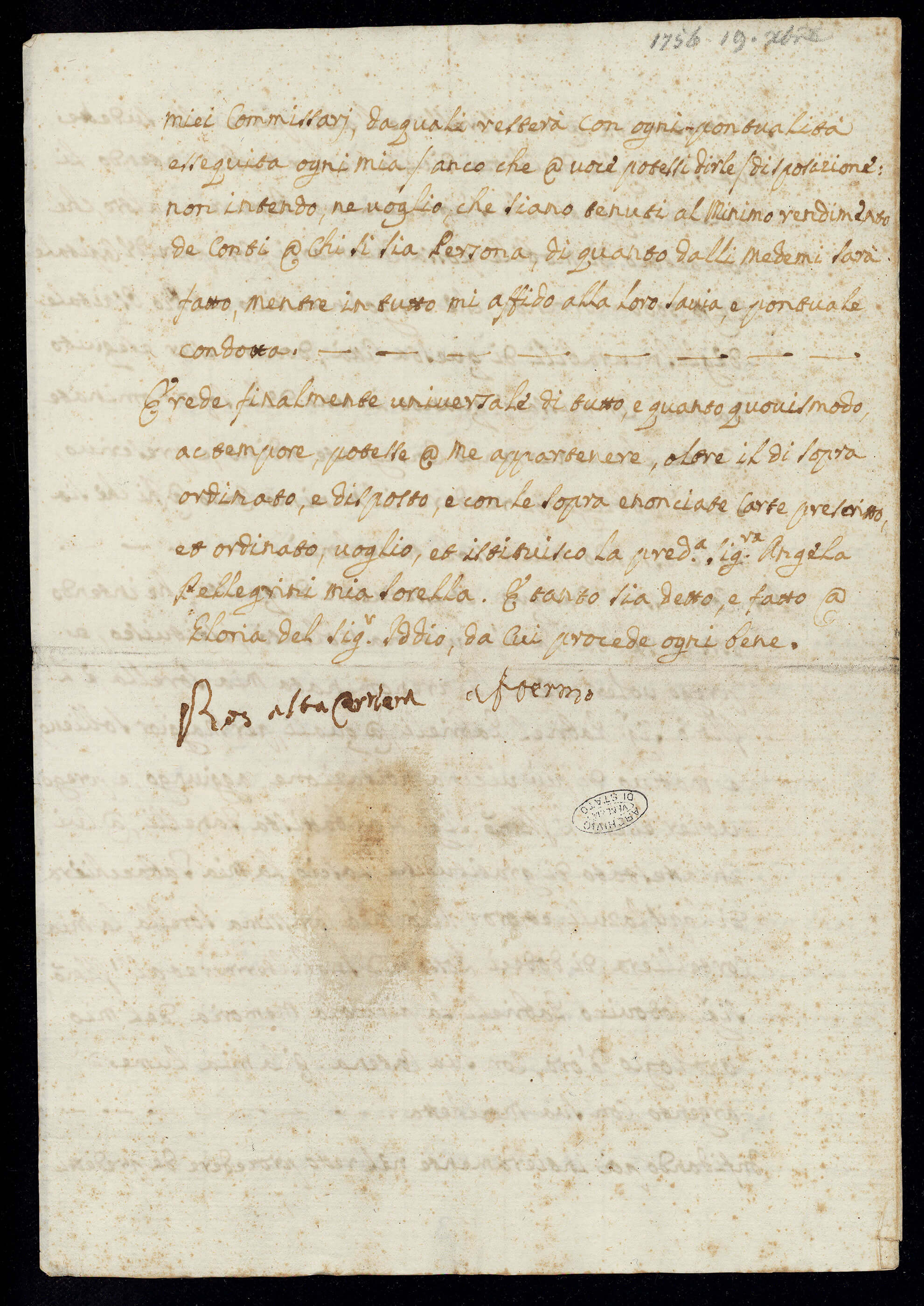 L'artista, ormai anziana, consegna al notaio Ludovico Gabrieli una cedola «scritta d'aliena mano» e il rogante precisa nel verbale che Rosalba «l'ha nel fine, nel miglior modo ha potuto, stante esser priva delle vista, sottoscritta».