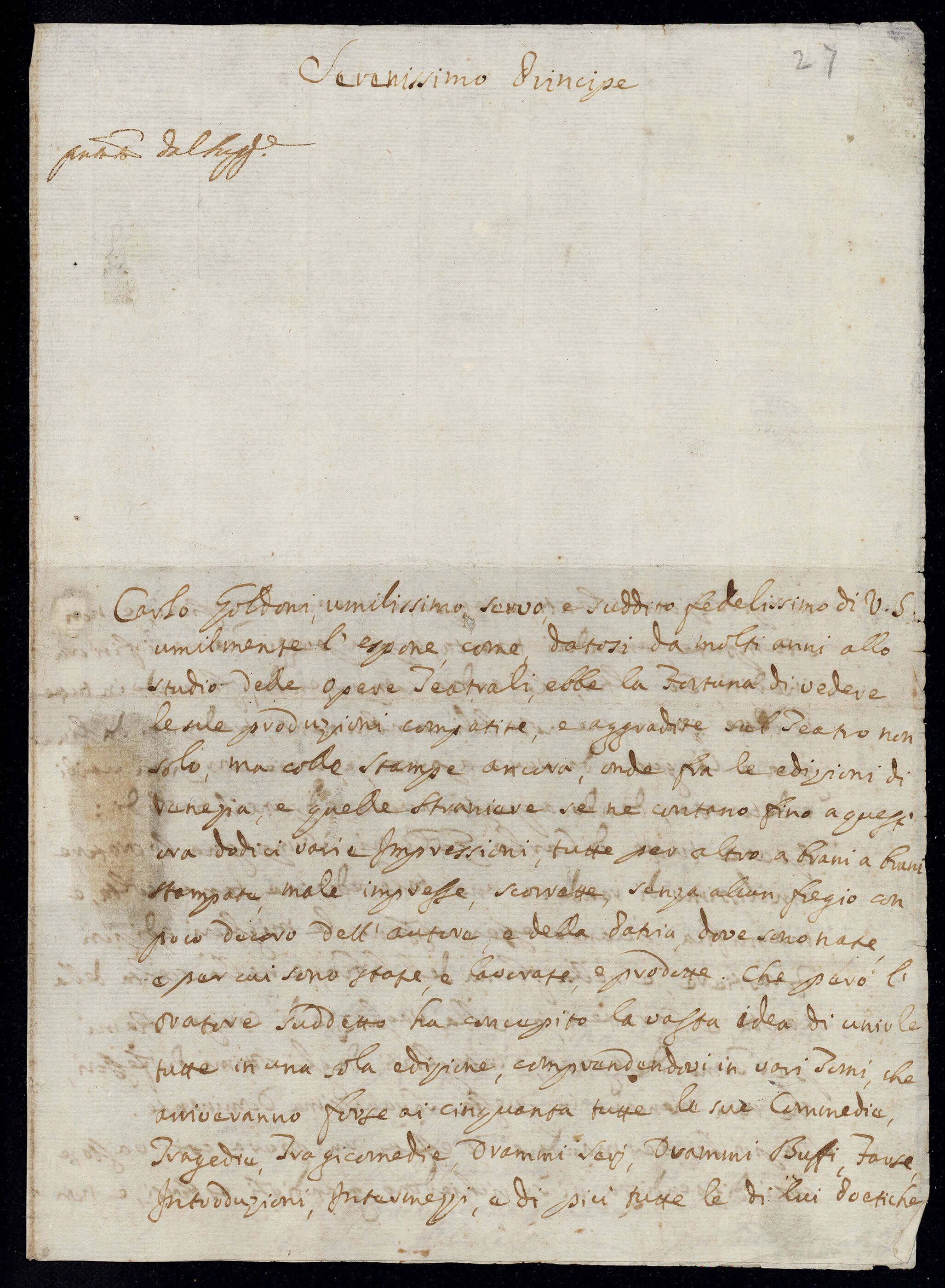 Nella Venezia del XVIII secolo la competenza di istruire le pratiche in materia di stampa e di censura spettava alla magistratura dei Riformatori allo Studio di Padova, organo composto da tre patrizi, creato nel primo Cinquecento e dotato di estesissima autorità su tutto ciò che oggi si direbbe attinente alla “cultura”: in primo luogo sull’Università di Padova, unica esistente negli Stati veneti, ma anche sull’istruzione e sulle scuole in genere, sulle pubbliche librerie e sulle accademie, che erano all’epoca assai diffuse. Nel dicembre 1760, pertanto, il commediografo Carlo Goldoni, «umilissimo servo e suddito fedelissimo di vostra serenità», indirizzò formalmente al Doge, come sempre si doveva (ma in realtà ai riformatori Angelo Contarini, Bernardo Nani e Francesco Morosini), una «supplica». Premettendo che, «datosi da molti anni allo studio delle opere teatrali, ebbe la fortuna di vedere le sue produzioni compatite e aggradite sul teatro non solo, ma colle stampe ancora», Goldoni lamentava però che le almeno «dodici varie impressioni» edite fino a quel momento fossero tutte «a brani a brani stampate, male impresse, scorrette, senza alcun fregio, con poco decoro dell’autore e della patria dove sono nate». Per rimediare a tale situazione, egli annunciò di avere allora concepito un ambizioso disegno editoriale: «la vasta idea di unirle tutte in una sola edizione, comprendendovi in vari tomi, che arriveranno forse ai cinquanta, tutte le sue commedie, tragedie, tragicomedie, drammi seri, drammi buffi, farse, introduzioni, intermezzi, e di più tutte le di lui poetiche composizioni volanti, stampate in varie occasioni e non stampate, unendovi trenta e più pezzi teatrali fin’ ora inediti ed altri che andrà componendo». Goldoni desiderava dunque ottenere dalle autorità l’autorizzazione e la concessione del «privativo privileggio per anni vinti» alla progettata stampa dei volumi, e comunicava di volersi avvalere dello stampatore Giovanni Battista Pasquali. Preso atto che Goldoni «intende di valersi de’ veneti torchi e di adornare la stampa in modo per cui venga credito alle stesse venete impressioni», i Riformatori accordarono al commediografo la privativa richiesta per i tomi, che si sarebbero intitolati «Opere tutte di Carlo Goldoni». L’edizione Pasquali del teatro goldoniano prese in effetti immediato avvio nel 1761.