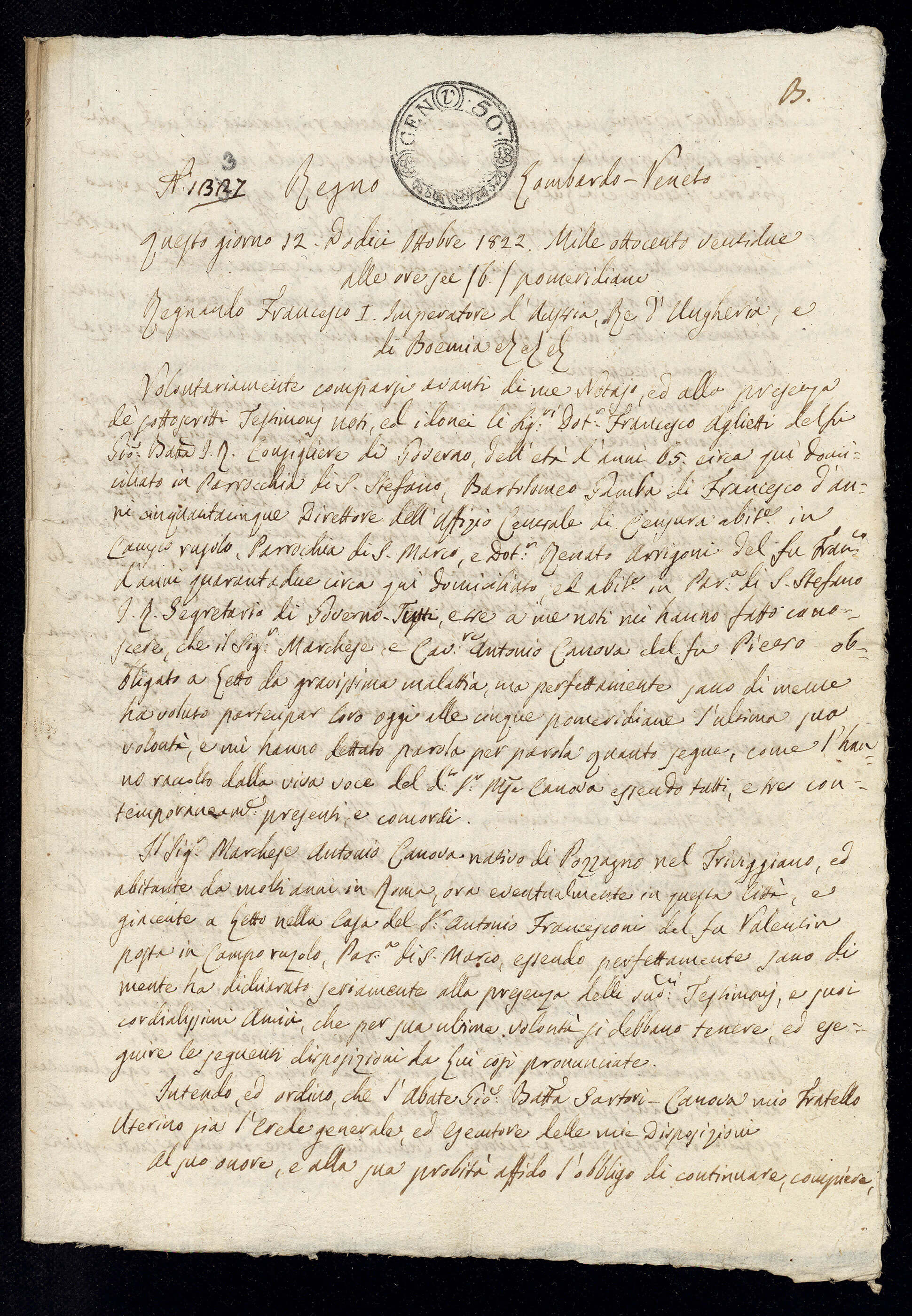 Nell'impossibilità di scrivere (sarebbe morto dopo sole poche ore), Canova detta le proprie ultime volontà a tre «cordialissimi amici», illustri personaggi pubblici, Francesco Aglietti, consigliere di Governo protomedico, Bartolomeo Gamba, direttore dell'Ufficio di censura di Venezia e Renato Arrigoni, segretario di Governo. Il testamento “noncupativo” viene rogato dal notaio Agostino Angeri un'ora più tardi, nella stessa casa di abitazione di Canova, ricevendo le unanimi dichiarazioni giurate dei tre. Questa forma testamentaria – di fatto senza il benché minimo intervento scritto del testatore – era resa possibile dall'art. 585 del Codice civile universale austriaco, adottato nel Regno Lombardo-Veneto a partire dal 1816. Solo pochi anni prima, in vigenza del Codice di Napoleone, non sarebbe stata ammessa.