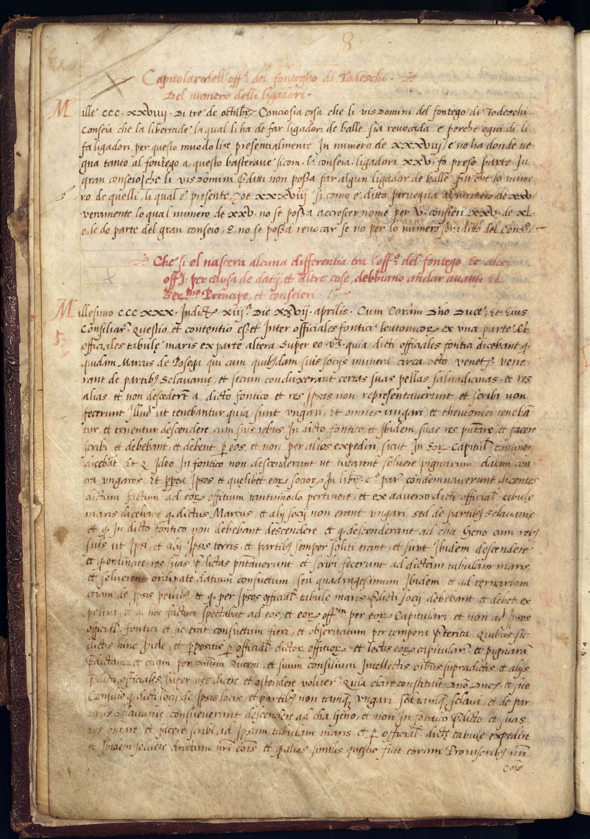 Nella Venezia tardomedievale la presenza tedesca, che si aggirava sui quattromila individui, era particolarmente cospicua. Porto e navi veneziani costituivano infatti il tramite tra l’Europa centro-settentrionale e il Levante; la comunità in senso lato germanica era dedita soprattutto al traffico di metalli (argento, oro, rame e stagno). Intorno al 1228 il Comune Veneciarum decise di affittarle stabilmente un edificio di proprietà pubblica a Rialto, nel quale potessero trovare ricetto mercanti e mercanzie, le quali dovevano essere poi smerciate per il tramite di sensali debitamente autorizzati. Si trattava del cosiddetto Fondaco (dall’arabo funduq, dal greco pandokion), che, distrutto dalle fiamme nel 1505, venne ricostruito nelle forme odierne e affrescato anche da Giorgione e Tiziano. La vigilanza sulle persone e sui traffici che vi si svolgevano venne affidata dalla metà del sec. XIII a un magistrato apposito, i tre Visdomini al Fontego dei Tedeschi, che «sorvegliavano la pesatura delle merci che vi venivano introdotte o estratte; rivedevano mensilmente le scritture dell’entrata e dell’uscita tenute dagli scrivani e dal fonticario; istruivano i processi contro i sensali che agivano nel Fondaco e li rimettevano ai consoli, che avevano giurisdizione su quelli; ricevevano la nota scritta dei contratti conclusi dai sensali con la loro intercessione; davano il permesso per lo scarico delle merci».