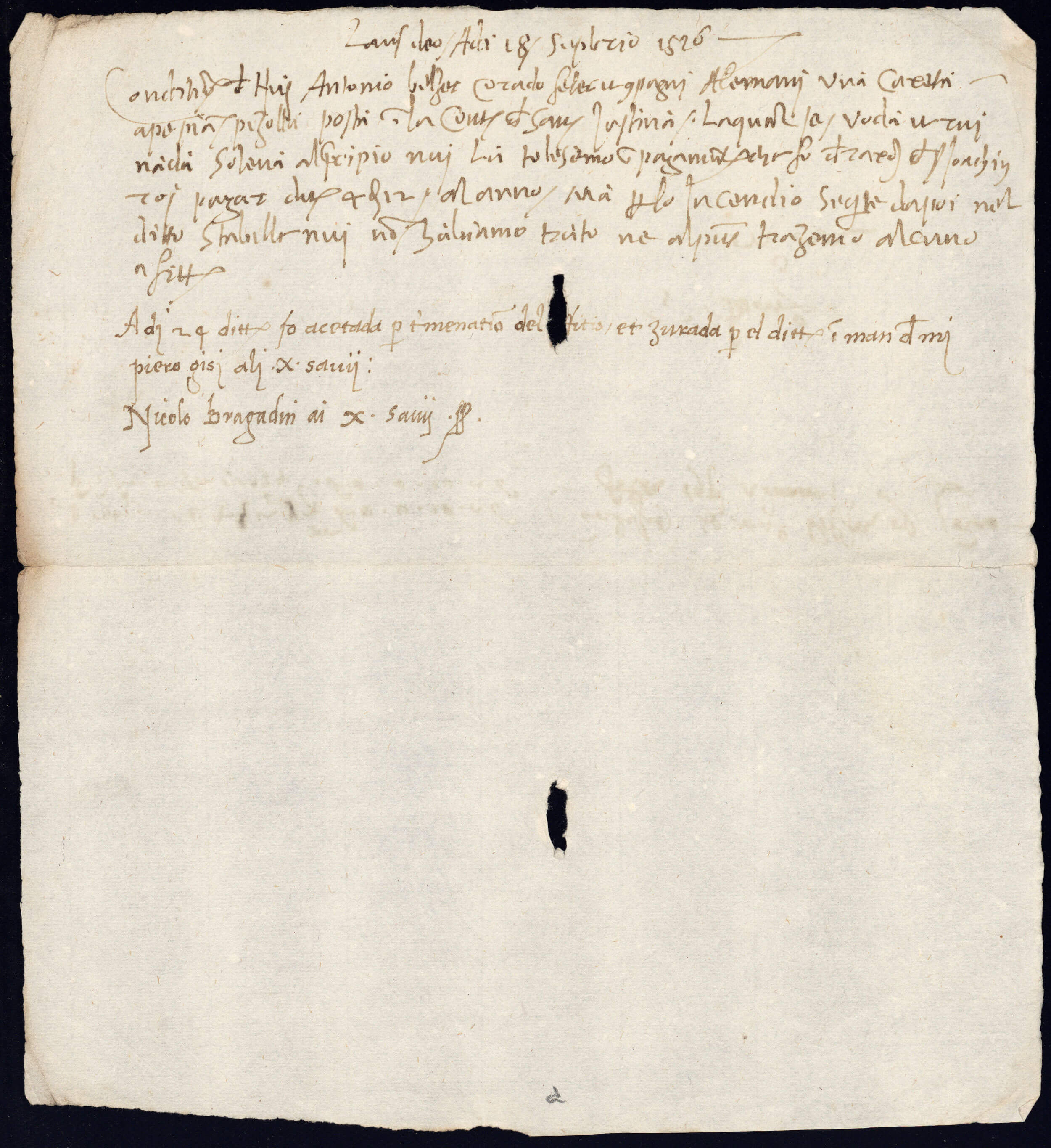 Il documento proposto è la condizione presentata da Antonio Belzer e Corrado Feler, «compagni», ovvero soci d’affari, nell’ambito del rinnovo d’estimo del 1514, resosi necessario dopo la perdita del prezioso archivio. Come risulta evidente dalla data del documento, la magistratura continua a raccogliere le notifiche dei nuovi proprietari fino alla redecima successiva, che avverrà nel 1537. I due soci, «alemanni» e quindi forestieri, si dichiarano proprietari di una casetta al piano terra nella contrada di Santa Giustina, dalla quale un tempo percepivano un reddito, affittandola. Tuttavia, a seguito di un incendio, la casa risulta ora in rovina e inutilizzabile.