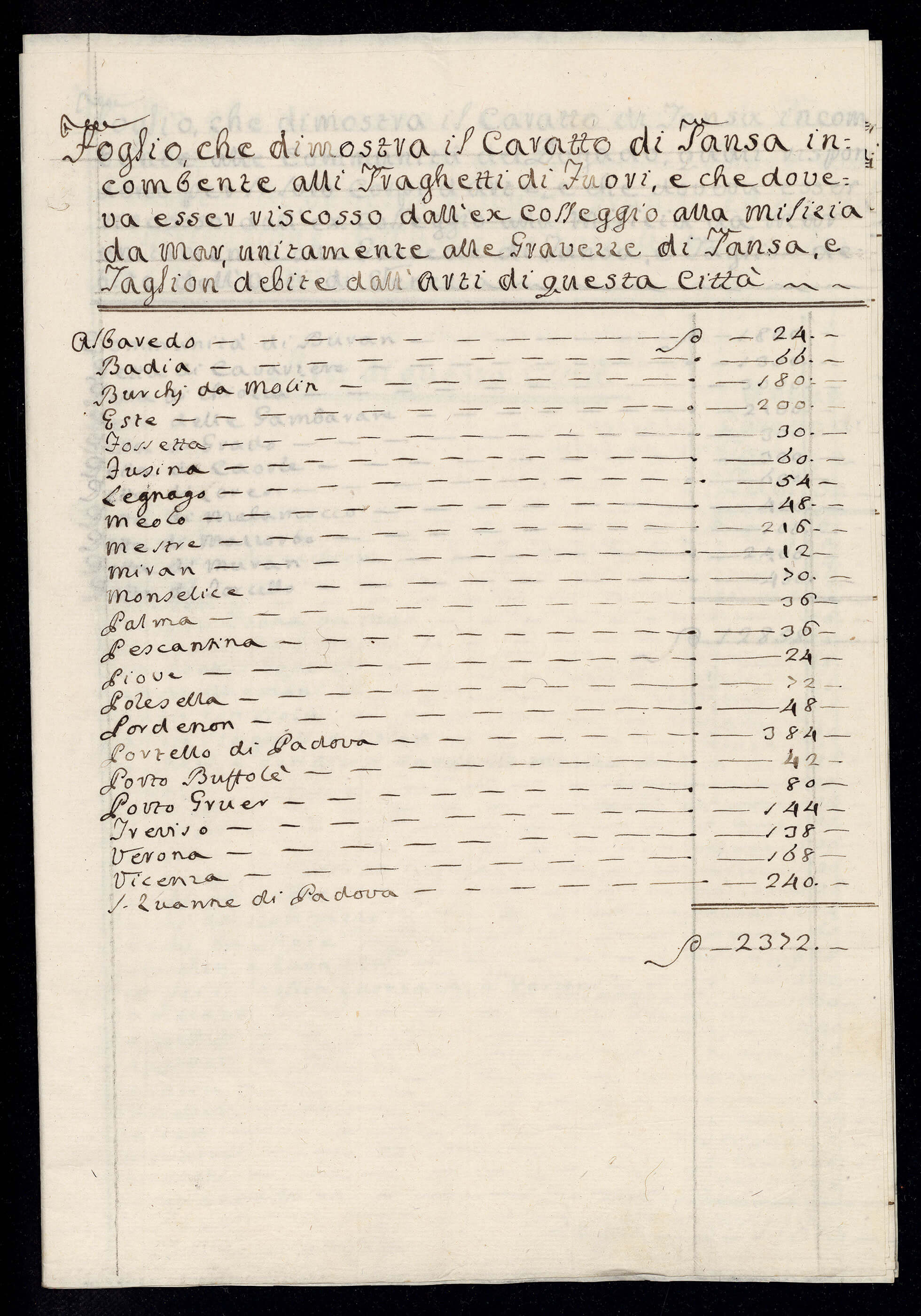Redatto nel 1798 con finalità fiscali dalla Deputazione tanse, taglioni ed estimo, il documento «dimostra il caratto di tansa» (la quota di ripartizione della tassa dovuta allo stato) assegnata ai vari traghetti «di fuori». Le località di destinazione sono elencate in ordine alfabetico; tra le località del Veneto orientale e del Friuli spiccano Palma (Palmanova), Portobuffolè, Porto Gruer (Portogruaro) e Pordenone, cui spettava la quota di 48 ducati sul totale di 2372. L’elenco fu presentato in allegato al decreto del 29 aprile con cui l’Imperial Regio Governo austriaco affidava alla Congregazione delegata la riscossione della «tansa insensibile» nell’ambito della riorganizzazione dell’apparato amministrativo subentrato a quello della cessata Repubblica. L’amministrazione economica complessiva delle comunità del Dogado rimaneva invece di competenza dell’Imperial Regia Commissione camerale, come previsto dal proclama del 31 marzo 1798. Fino ad allora, la «tansa insensibile» era stata materia spettante al Collegio della Milizia da Mar, istituito nel 1545, di cui facevano parte rappresentanti di magistrature diverse per provvedere all’arruolamento dei rematori per le galee della flotta, che venivano sia forniti dai centri del Dogado (Chioggia, Cavarzere, Murano, Burano, Caorle, Grado…), sia dalle arti e fraglie dei traghetti veneziani. Gradualmente, con il trascorrere del tempo, tale prestazione d’opera venne sostituita da un’imposta assegnata proporzionalmente a ciascuna comunità e corporazione, chiamata appunto «tansa insensibile». La rete dei traghetti «da fuori» o «da viaggio», che portavano a tutte le principali città dell’entroterra veneto, attiva almeno fin dal primo Cinquecento, era dunque ancora ben sicura e funzionante allo scadere del XVIII secolo: doveva farvi affidamento chiunque arrivasse o partisse da Venezia senza un’imbarcazione propria. Gli stazi di questi traghetti erano dislocati su tutta l’area urbana, con maggior concentrazione presso l’isola-mercato di Rialto. La Patria del Friuli – così come il Padovano, il Ferrarese, il Trevigiano – era raggiungibile mediante una trama di canali collegati ai fiumi Sile, Piave, Livenza, Lemene e Tagliamento, che consentiva i più facili «viaggi di dentro via», rotte fluviali interne, evitando la navigazione marittima costiera, assai più pericolosa in caso di maltempo, e che collegava i centri di Burano, Torcello, Musestre, Casale, Caorle, Latisana, giungendo fino a Marano, Grado, Gemona e Udine. Le imbarcazioni provenienti da Pordenone ebbero a disposizione due approdi: quello di Riva del Carbon e quello di Riva del Ferro dal 1690; nel 1694 l’istituzione di un traghetto che collegava la città a Portobuffolé, Motta e Meduna rese più efficienti i traffici commerciali. A Venezia il traghetto dei barcaioli di Pordenone fu istituito il 24 settembre 1701, sotto la protezione di san Nicolò e faceva parte dello stazio di Ca’ Dolfin, che aveva la cavana sulla riva del Ferro, al riparo del portico del palazzo. Garantiva il collegamento con la riva opposta all’altezza del demolito Fontego della Farina, a destra dello sbocco del rio di San Silvestro, interrato nel XIX secolo. L’imbarco per Pordenone, Portobuffolè e Gemona, invece, era collocato più avanti, sulla riva verso il ponte di Rialto, con una corsa a settimana che impiegava tre giorni per percorrere le 150 miglia che separavano le due città.