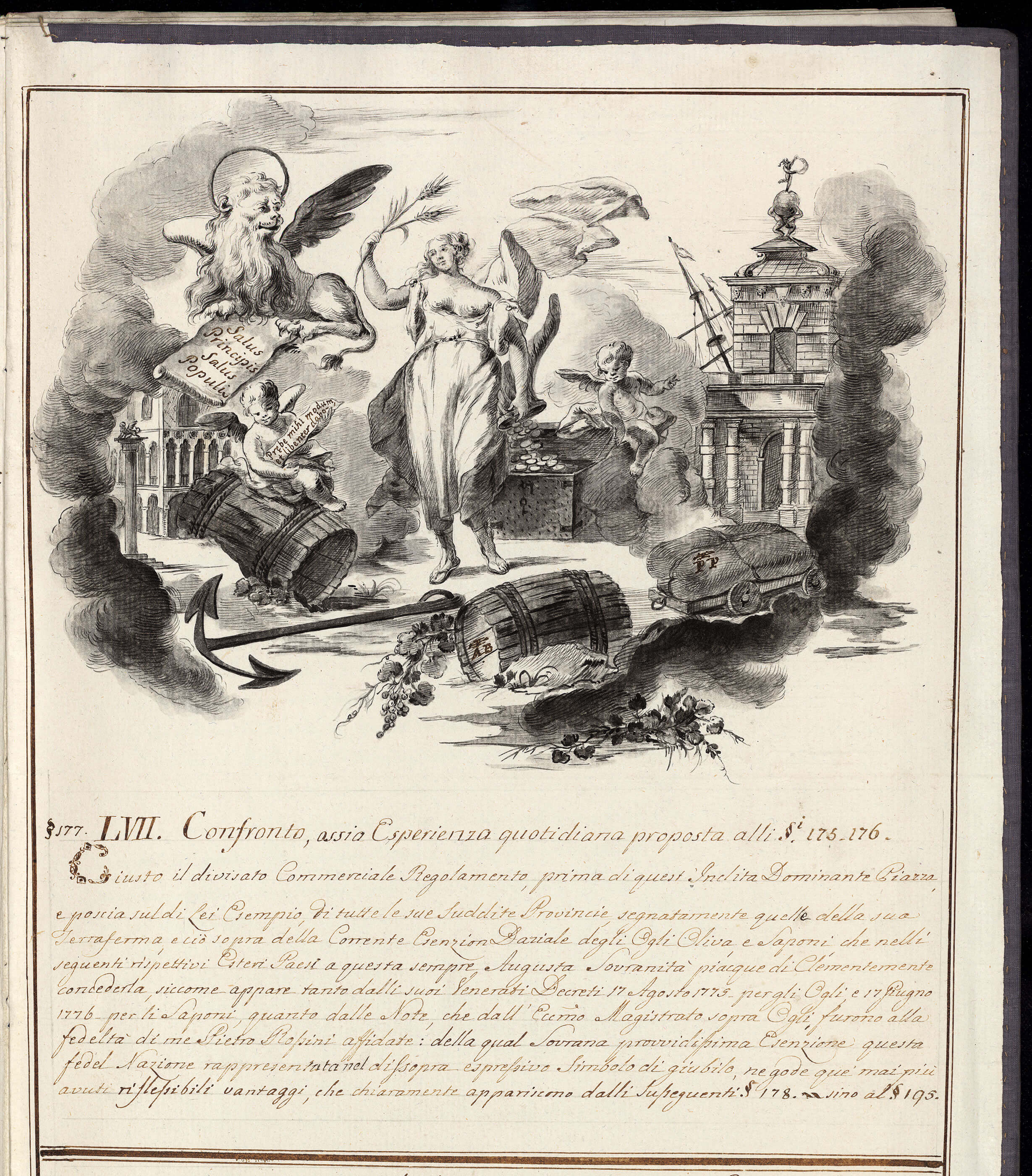 Nella seconda metà del Settecento, la consapevolezza del crescente declino del peso politico, militare ed economico di Venezia nello scacchiere italiano ed europeo si fece progressivamente strada in seno alla componente più avveduta del patriziato al potere. La politica di stretta neutralità adottata dalla Serenissima nel corso dei continui e sanguinosi conflitti che avevano attraversato lungo tutto il secolo il continente, mutandone la fisionomia e comportando l’insorgere di nuovi equilibri, se da un lato aveva salvaguardato, almeno temporaneamente, la sopravvivenza dello Stato veneziano, dall’altro lo aveva però consegnato sguarnito di ogni potenza a ulteriori sviluppi che si fossero potuti pericolosamente determinare. Riformare la Repubblica appariva dunque ineludibile a quanti avevano più a cuore la conservazione di un’autonomia marciana; ma modificare secondo principi di razionalità l’impalcatura socio-politico-istituzionale di un’entità così complessa, di derivazione medievale, appariva assai difficile, se non impossibile, a meno di non voler correre l’improponibile rischio di mettere in discussione lo stesso ruolo dell’aristocrazia patrizia e il sistema sociale complessivo. Meno azzardata sembrava invece la ricerca di una ripresa programmata delle attività economiche, magari rianimate dalla spinta e dal sostegno del governo. In questo senso furono esperiti – anche se con esiti finali che non di rado furono poco felici – vari tentativi: uno di questi riguardò la riforma del sistema doganale, che soffocava la circolazione delle merci con oneri pesanti e una tassazione eccessiva. Furono studiate riforme daziarie, al fine di semplificare il quadro generale e possibilmente ridurre a un’unica tariffa di consumo tutti i dazi in precedenza esistenti. Anche i privati vennero sollecitati a più riprese a fare giungere al governo proposte e indirizzi migliorativi; rispondendo a un appello in questo senso, contenuto nel decreto senatorio del 1 giugno 1775, un certo Pietro Rossini, di Bergamo, presentò ai Cinque savi alla mercanzia, organo preposto alla gestione complessiva della materia, un piano per far risorgere il commercio, articolato in «otto cardinali rimedii». Un motivo d’interesse dell’albo inviato per l’occasione da Rossini alle autorità risiede anche nei disegni che lo ornano, uno dei quali raffigura la Punta della dogana, eretta dall’architetto Giuseppe Benoni allo scadere del XVII secolo, ricompresa in una complessa allegoria del commercio e della navigazione bene ordinati.
