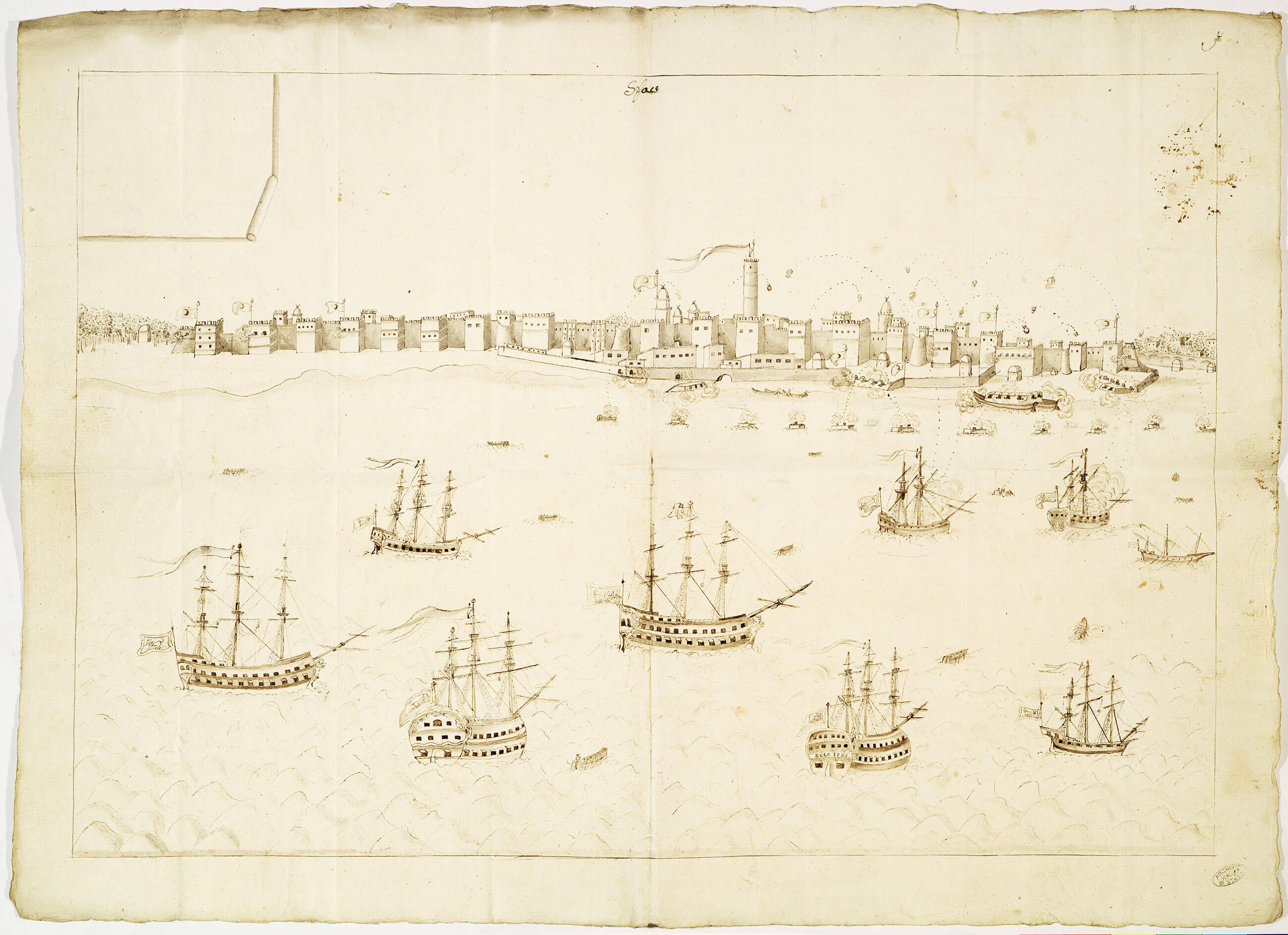 L’interessante veduta, da tempo rinvenuta nel fondo archivistico dei Cinque savi alla mercanzia e successivamente ricondotta alla raccolta miscellanea di mappe dell’Archivio, consente di documentare uno degli ultimi episodi della storia della marineria veneziana, cadente allo spirare del XVIII secolo e alla vigilia della fine della Repubblica. I rapporti tra Venezia e le cosiddette «reggenze» o «cantoni» di Algeri, Tunisi e Tripoli – i paesi «barbareschi», nominalmente soggetti al sultano di Costantinopoli, ma in realtà autonomi e dediti a un’intensa attività corsara ai danni dei mercantili europei – furono, nel corso dei secoli, non di rado tribolati. Tra alterne vicende, la navigazione commerciale veneta sulle rotte di Ponente fu progressivamente minacciata dal pericolo che i bastimenti venissero assaliti e sequestrati, con carico ed equipaggio, dai veloci navigli nordafricani, sicché i costi di assicurazione si fecero pressocché insostenibili e sempre maggiore divenne la difficoltà di reclutare marinai, al punto da minacciare seriamente ogni velleità di ripresa marittima studiata dal Senato. Dopo vari tentativi di contromisure, rivelatisi tuttavia non efficaci, la Repubblica intorno alla metà del Settecento decise di seguire l’esempio di quasi tutte le altre potenze europee e optò per la sottoscrizione di accordi diretti con le tre città-stato: in cambio del versamento di un corrispettivo annuo, ogni insidia alle navi veneziane doveva cessare. A più riprese, però, insorsero rilevanti questioni sull’interpretazione di tali «capitolazioni», sicché la squadra navale veneziana mosse alla volta di Algeri, agli ordini di Angelo Emo, nel 1768, e verso Tripoli, con Iacopo Nani, eletto capitano delle navi, nel 1766, ottenendo, grazie a tali azioni intimidatorie, il rispetto delle condizioni di pace. In seguito a un nuovo incidente, nel 1784 la Repubblica si scontrò con il bey di Tunisi: una squadra navale, ancora al comando di Angelo Emo, si portò allora a bombardare le fortezze costiere tunisine, come illustrato dal disegno, che mostra le azioni contro Sfax. Tra alterne vicende, le ostilità si protrassero fino al 1792, e ottennero larga risonanza nella pubblicistica coeva. Tra Otto e Novecento, poi, la figura di Emo e le operazioni delle sue navi vennero largamente riprese ed esaltate nella storiografia, sovente in forma acritica e al di là del loro effettivo successo militare, in funzione della rinnovata proiezione mediterranea dello Stato italiano unitario.