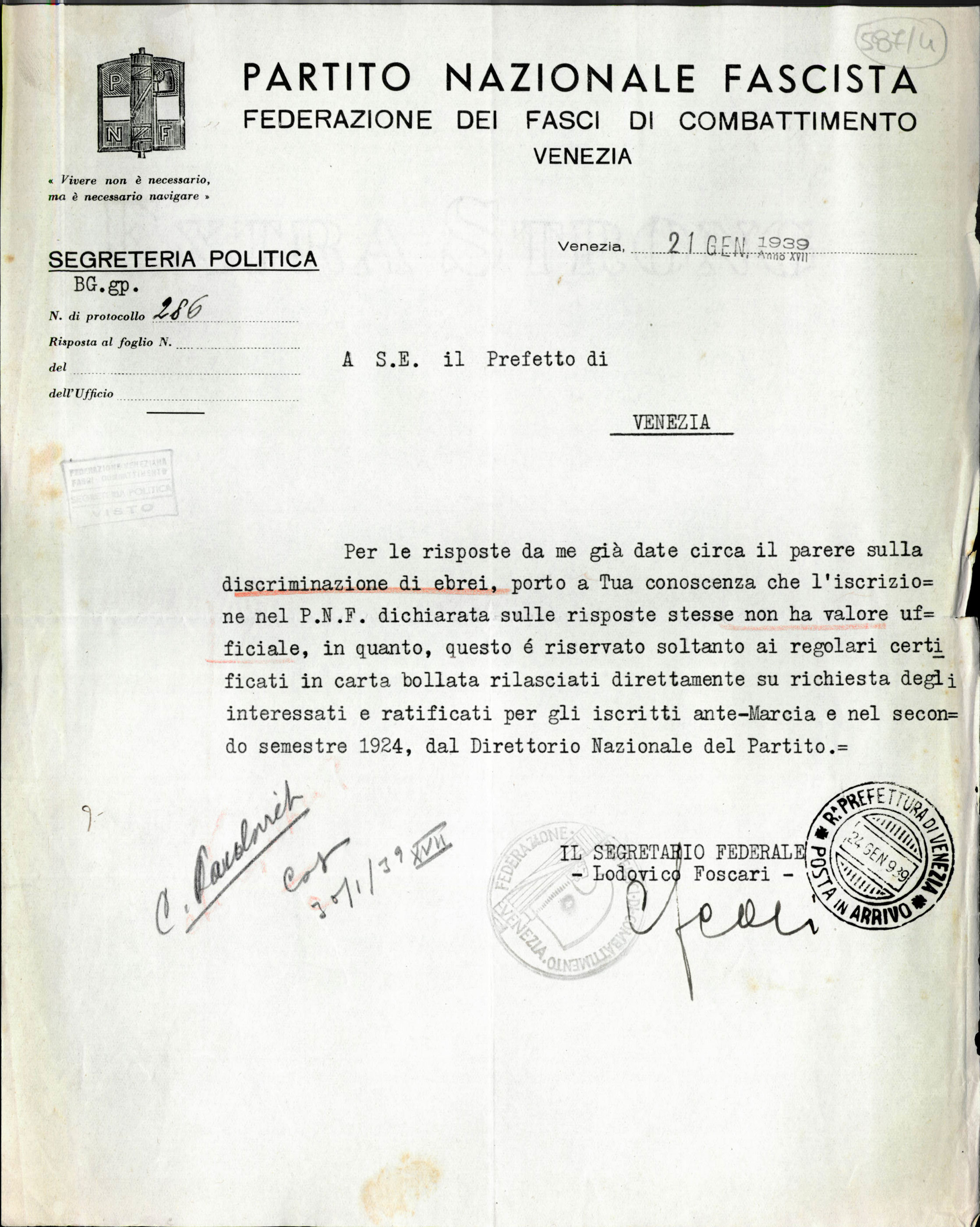Prefettura di Venezia, Gabinetto, Affari generali e affari ebraici, Serie generale, b. 3, fasc. 587